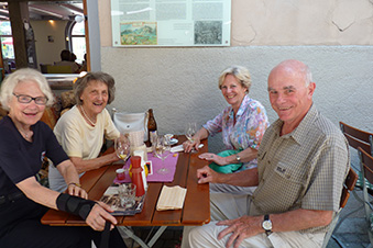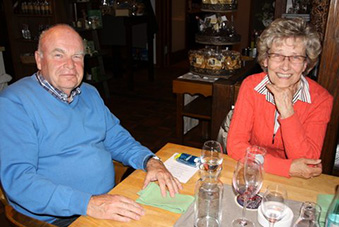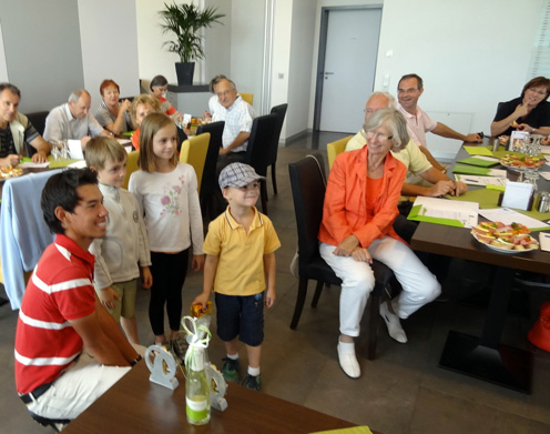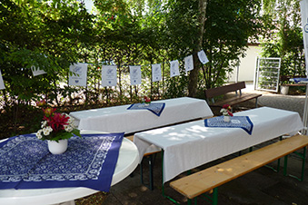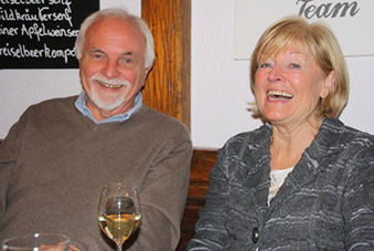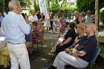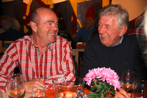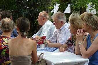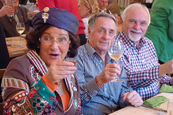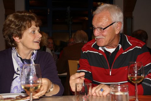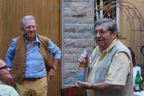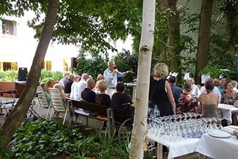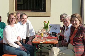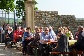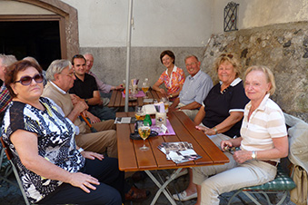 Bei herrlichem Spätsommerwetter feierten 40 Harmonieler am 7. September wieder das vergnügliche Weinbergfest der Harmonie. Von der Sonne gewärmt und mit unserem gut gekühlten Harmonie-Silvaner im Glas genossen wir den Blick über das romantische Werntal und inspizierten den Zustand unseres Weinbergs. Die Trauben des 2013 Jahrgangs waren gesund und prall und lassen auch für das kommende Jahr einen guten Tropfen erwarten. Nach den ersten Schoppen Wein ging es dann entweder zu Fuß oder mit dem Bus in die „Goldene Krone“, dem Wirtshaus unser Winzer Andrea und Georg Müller. Dank der Anstrengungen von Freunden und Familie war trotz des komplizierten Armbruchs von Georg Müller alles zu unserer größten Zufriedenheit. Im schön geschmückten Innenhof warteten bereits leckere Speisen vom Grill und natürlich gut gekühlte Flaschen Wein auf uns. Der 2012er Jahrgang, der an diesem schönen Tag zum ersten Mal verkostet wurde, entpuppte sich als großartiger Tropfen, dem anständig zugesprochen wurde. Gegen 21 Uhr ging es nach vielen Juchhees, Witzen und Anekdoten (hier tat sich unsere ewig-junge Ilse Pötsch wieder hervor) wein- und glückselig zurück nach Schweinfurt – in Vorfreude auf das kommende Weinfest! |