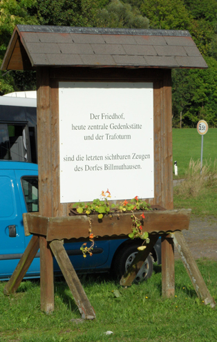 | Gedenktafel für das ehemalige Dorf Billmuthhausen, das der innerduetschen Grenze weichen musste. | ||