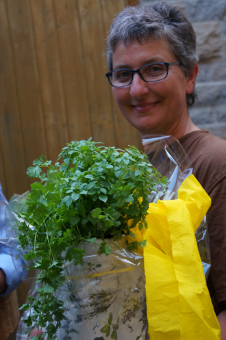 Ein „Gewürzstiefel“ für Winzerin Andrea Müller als Dank für die schönen Stunden in Reuchelheim. |